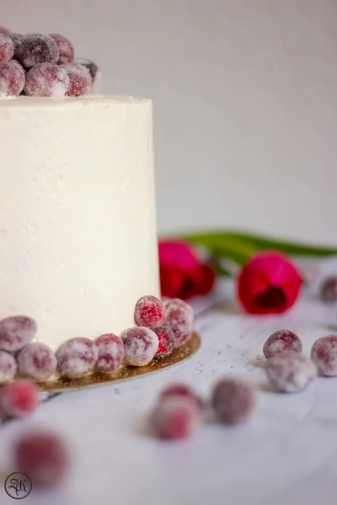 Heute stelle ich euch endlich diese Schönheit vor. Die gezuckerten und getrockneten Cranberries verleihen der Torte eine schlichte Eleganz und ihr leichtes Knacken macht den Genuss zu einem besonderen Erlebnis.
